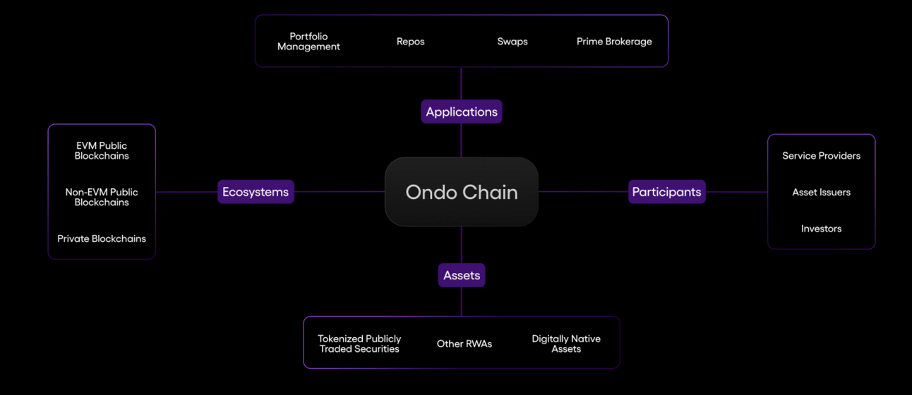 A Ondo Chain, uma blockchain Layer-1 permissionada, foi projetada para atender aos padrões institucionais de segurança e conformidade, enquanto mantém a acessibilidade de blockchains públicas como Ethereum.